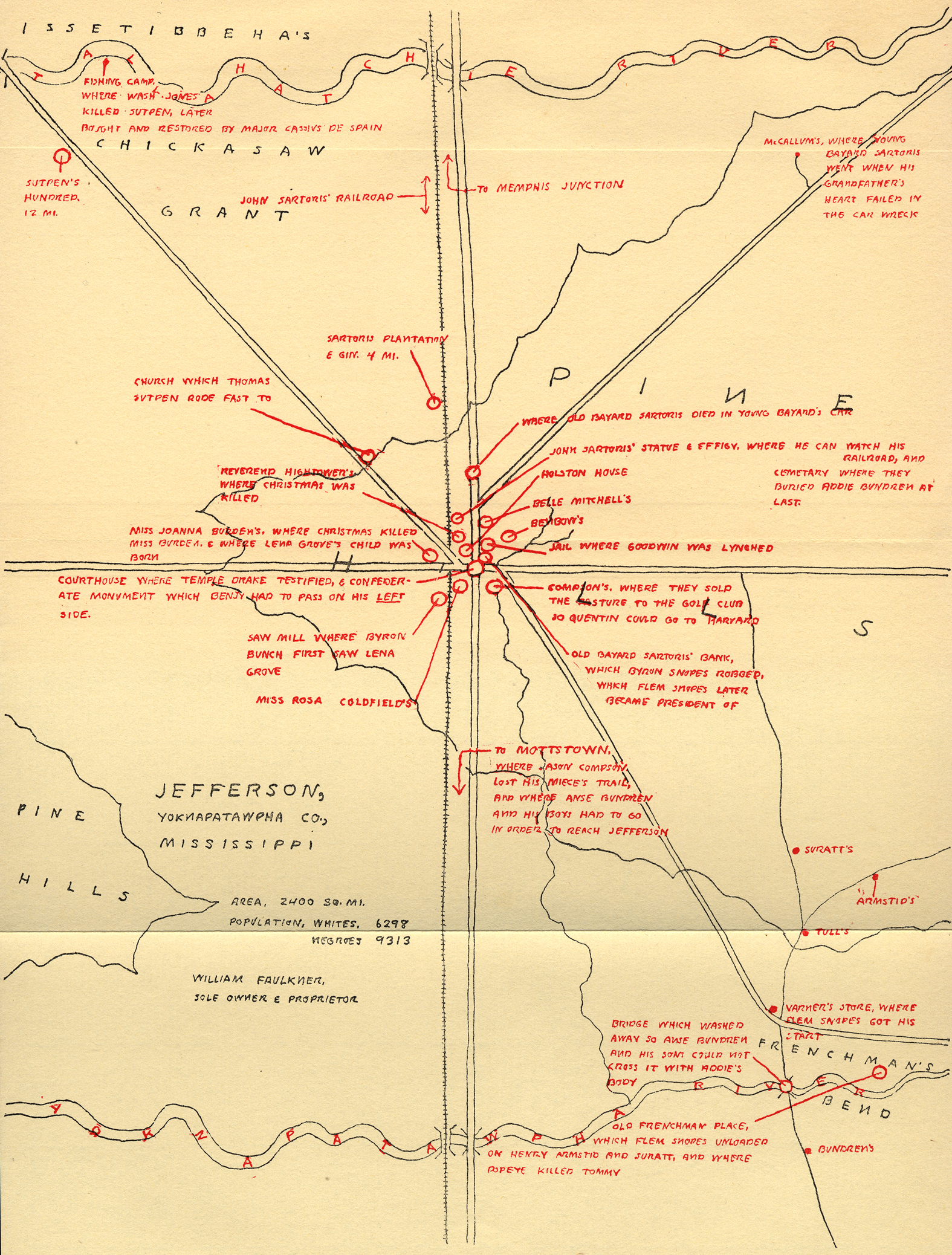 Los mapas de Yoknapatawpha [jɒknəpəˈtɔfə] el condado ficticio que sirve de hogar de las grandes novelas de Faulkner, dibujados por el propio escritor (via OpenCulture)