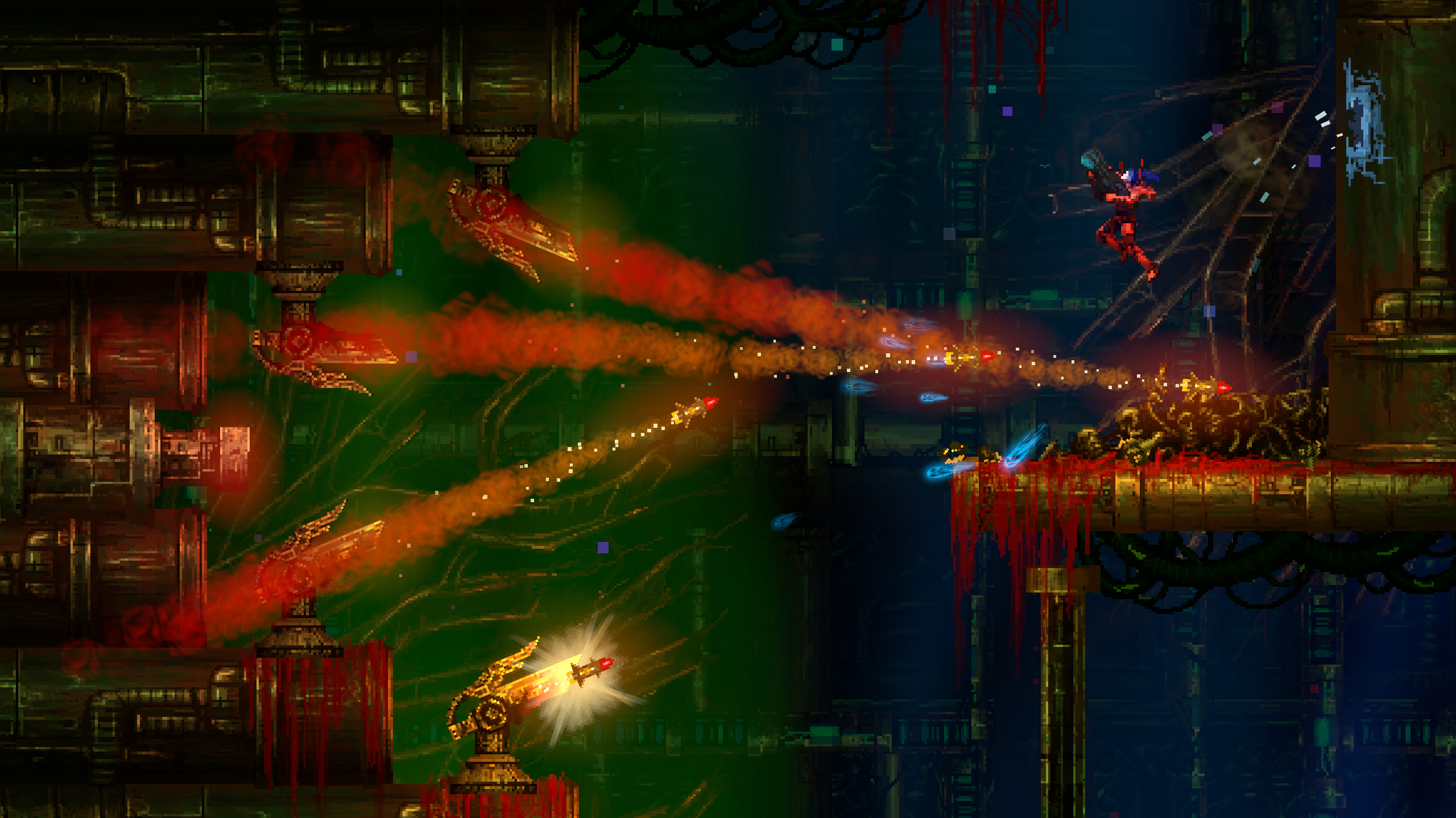 Llevo unos días jugando a Valfaris, una combinación de «corre, mata y Heavy Metal» especialmente frenético, lo que en mis torpes manos se convierte en un verdadero infierno. El juego te propone que combines armas de fuego de munición ilimitada (yay!) con espachas y hachas para rellenar una barra de energía que puedes invertir en a) un escudo de mierda o b y preferible) trabucos de destrucción masiva con balas finitas que te permiten convertir el escenario, durante unos gloriosos instantes, en un páramo de vísceras. Suena realmente bien hasta que descubres que la imagen del principio de este post pertenece a un instante relativamente fácil en comparación con las hordas inacabables de bichos, plataformas explosivas y habitaciones-trampa que empieza a lanzarte el animalico aproximadamente 15 minutos después. Pero hay cierta variedad en esta ensalada de tiros, de cuando en cuando. Armas del día que se lo pidas, juegos de trile con un jefe, plataformeo vertical puro, y episodios esporádicos en los que pilotas un robot mostrenco con una calavera gigante en el pecho, tridente, ametralladora y lanzallamas, prácticamente invulnerable, para descargar tensión acumulada.
