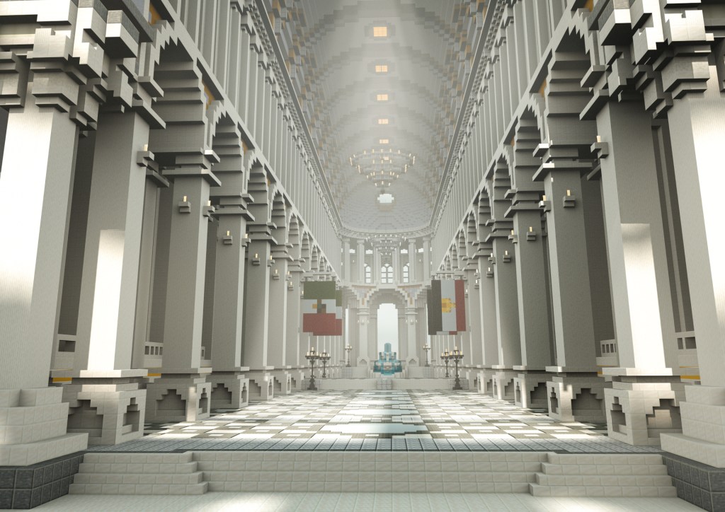No exagero con lo de monumental. Según la nota de prensa, la biblioteca, de estilo neoclásico, tardó tres meses en ser levantada, con la colaboración de 24 constructores de 16 países diferentes, a lo largo de 250 horas de trabajo. Está compuesta por 12,5 millones de bloques, la unidad de construcción básica del juego: un cubo de un tamaño de 16 píxeles por lado. Su traducción real, oficiosa, es de un metro cúbico. El diámetro de la cúpula del edificio es de unos 300 bloques. En nuestro mundo sería la segunda más grande del planeta, solo diez metros más pequeña que la del Estadio Nacional de Singapur.