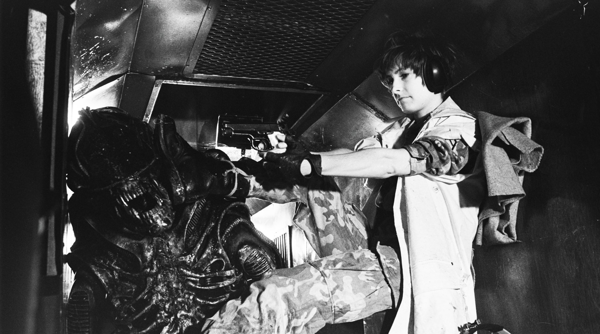 Otra foto: Gale Anne Hurd, la productora de Aliens, en el rodaje, sustituyendo a Jenette Goldstein (Vasquez). Suya es la bota en la cabeza del Alien, suya es la pistola que le pega dos tiros en la cabeza. De su Twitter.