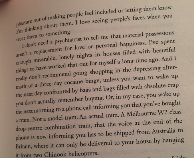 Después de tres días esnifando cocaína sin parar, Elton John descubre que se ha comprado un vagón de tren y se lo están trayendo dos helicópteros a su casa (via)